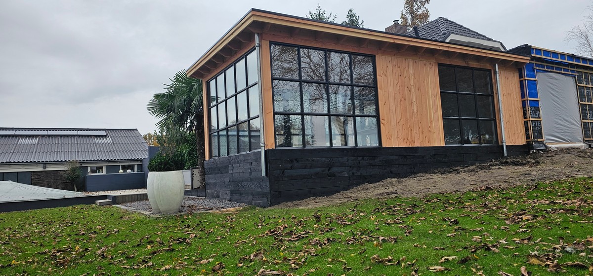 De absolute blikvanger? De elegante steel look ramen met openslaande deuren. Deze geven de tuinkamer een chique, industriƫle uitstraling en zorgen voor veel daglicht in de ruimte. In combinatie met het warme hout ontstaat een perfecte balans tussen modern design en natuurlijke charme.