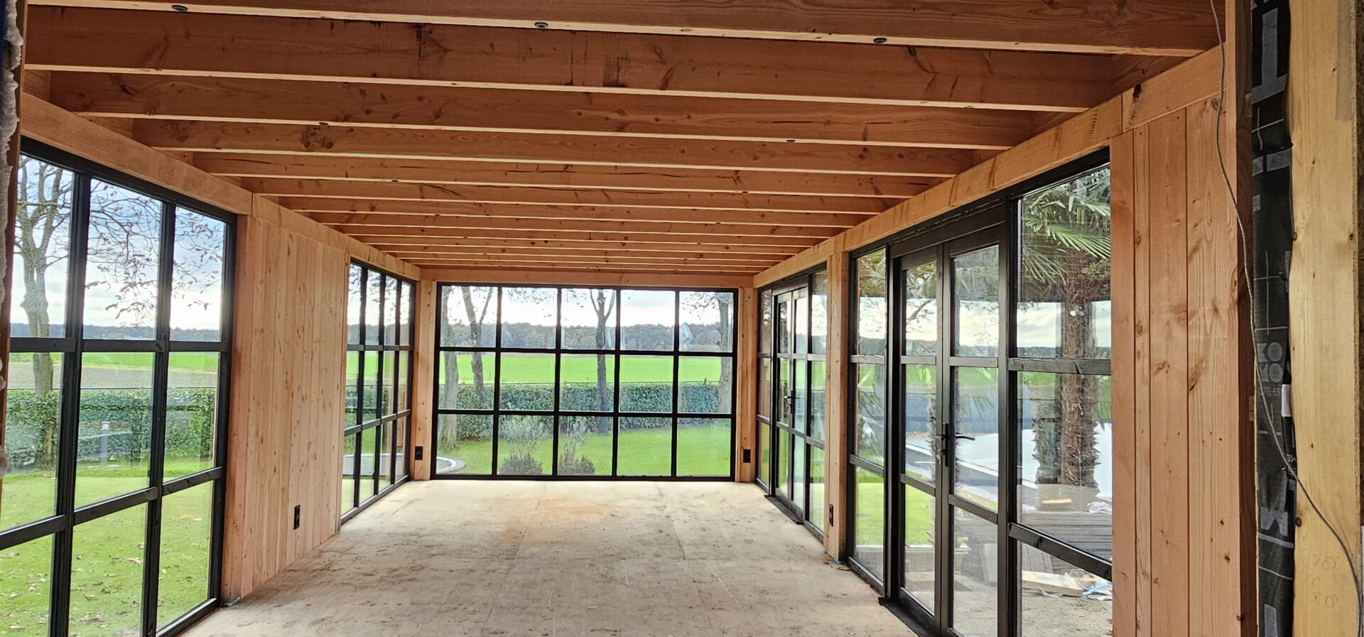 Als we het over exclusieve houtbouw hebben, dan is dit project daar een prachtig voorbeeld van. Voor deze klant realiseerden we een tuinkamer vol karakter, gebouwd op een verhoogde vloer voor een extra ruimtelijk gevoel en optimale aansluiting op de tuin. De gehele constructie is opgebouwd uit geschaafd hout, wat zorgt voor een strak, modern en hoogwaardig eindresultaat.