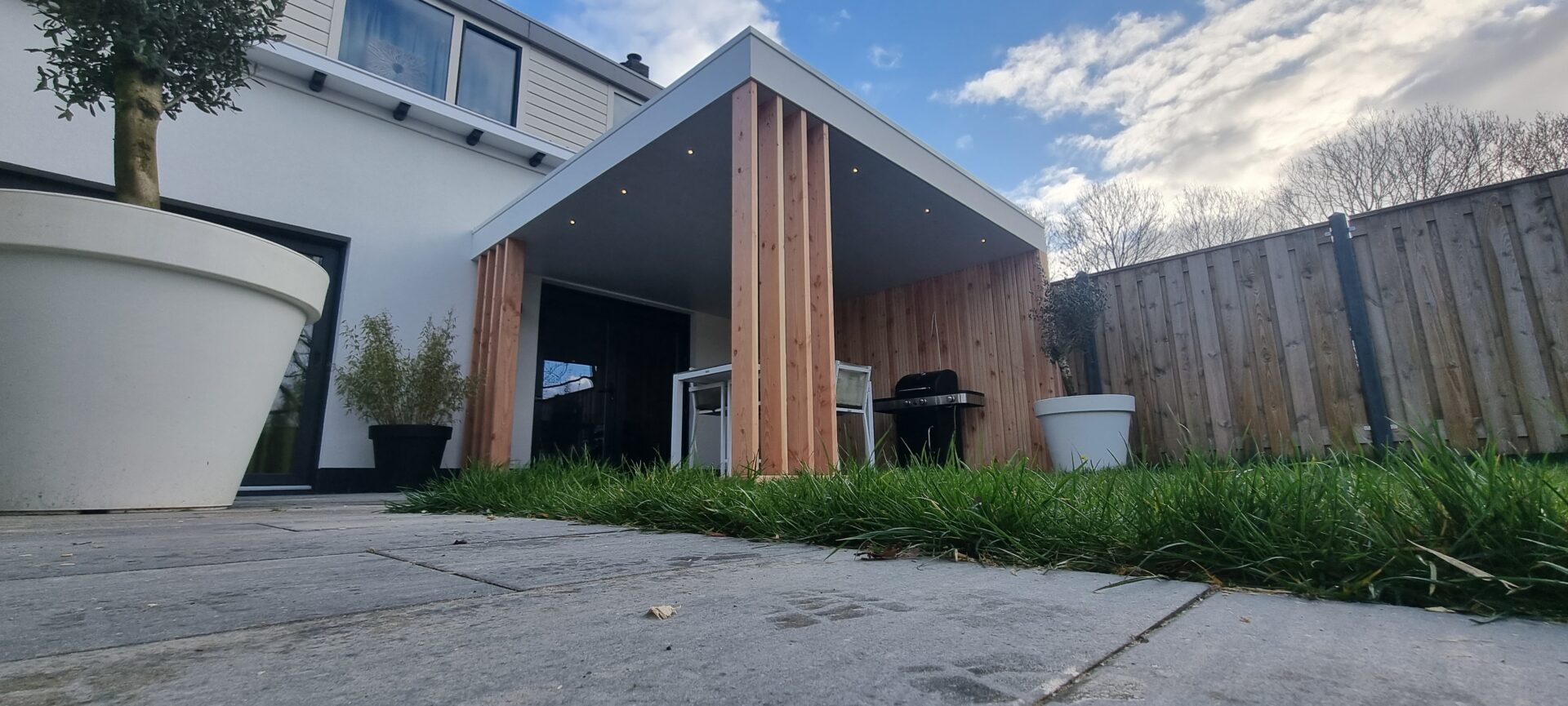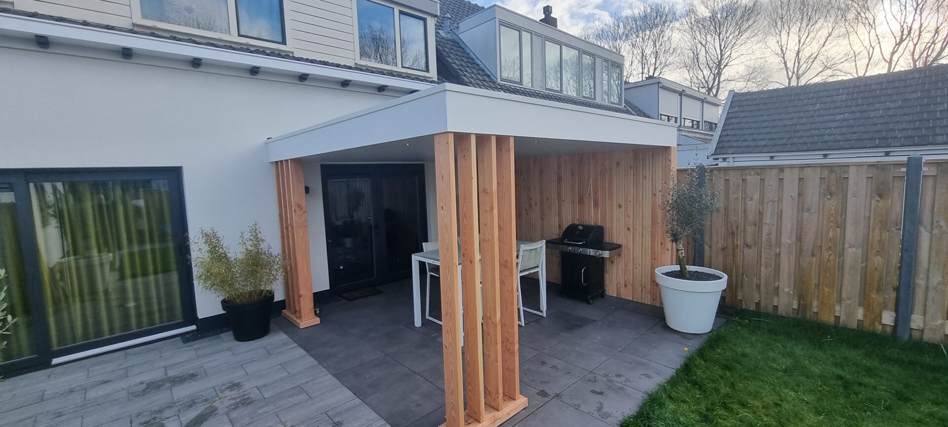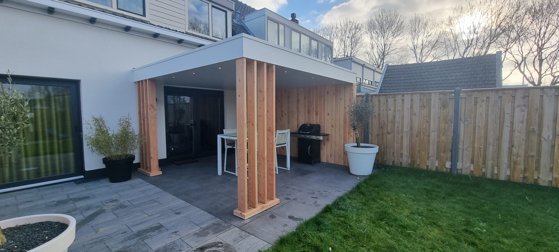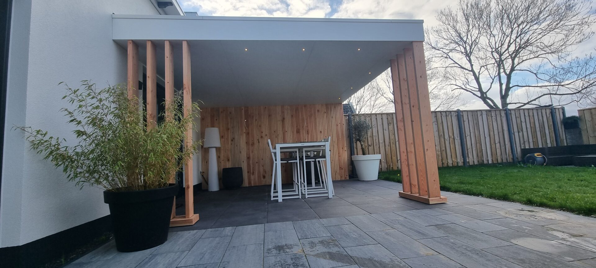 De open houten kolommen zijn uitgevoerd in geschaafd Douglas hout, wat het geheel een luchtige en eigentijdse uitstraling geeft. Dankzij de zorgvuldige aansluiting op de bestaande woning voelt deze overkapping als een natuurlijke verlenging van de leefruimte.