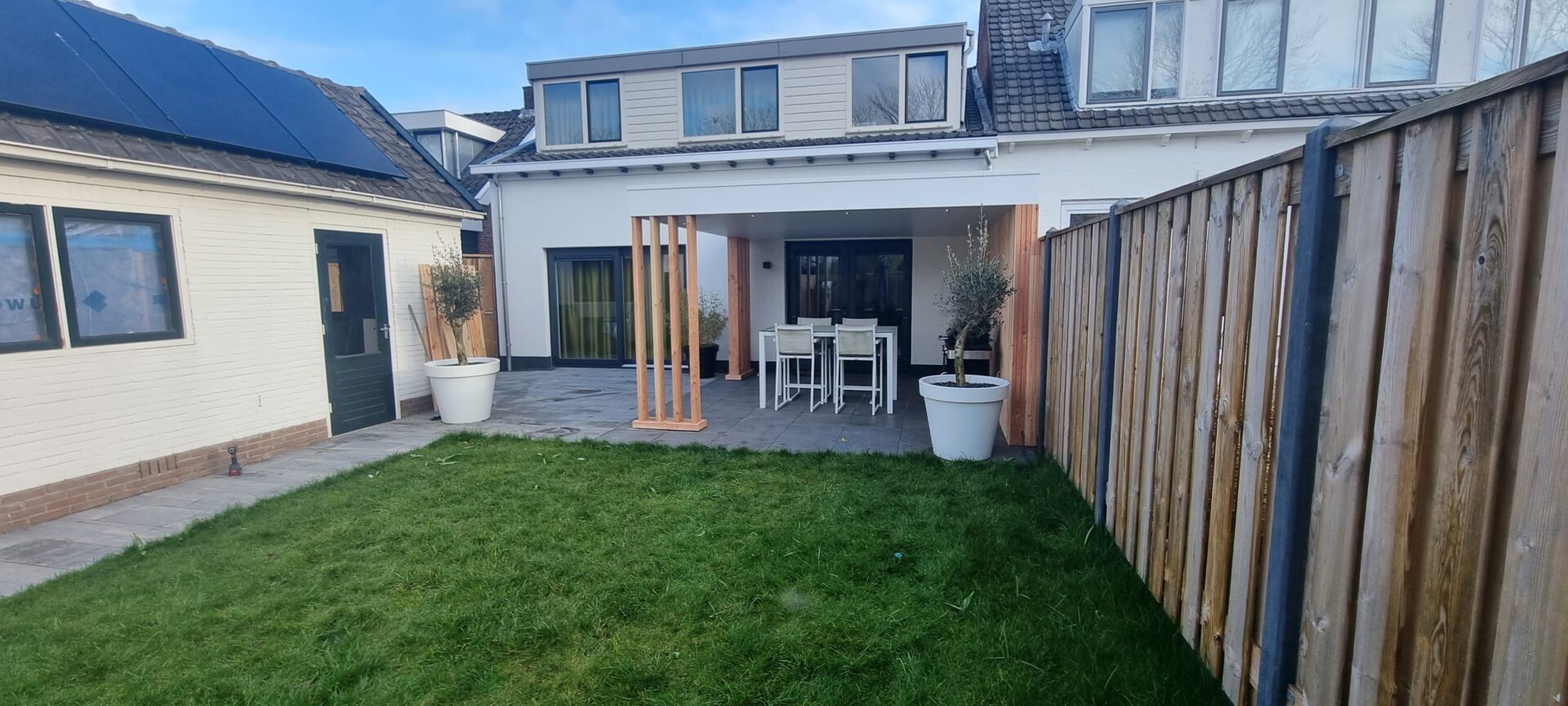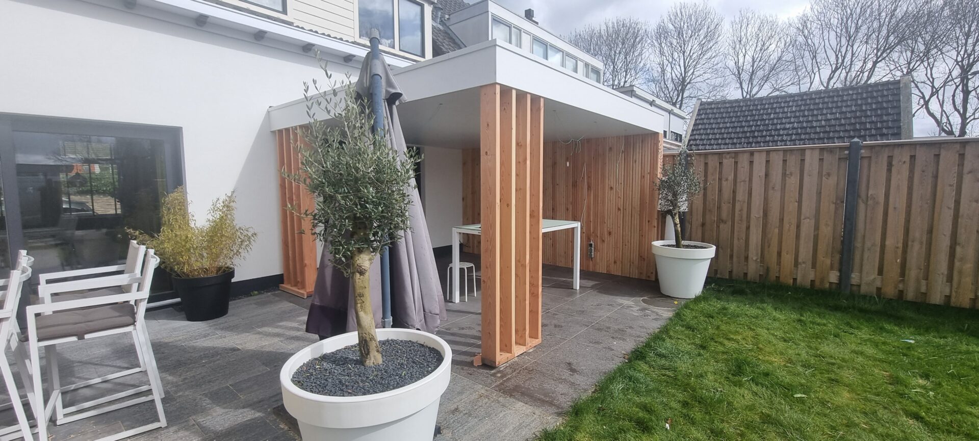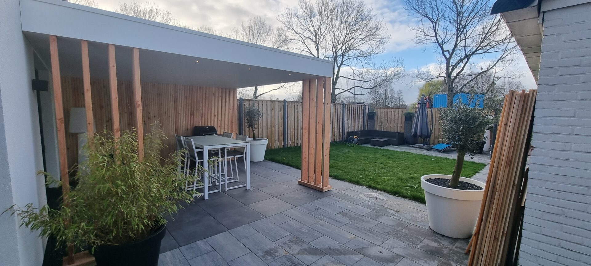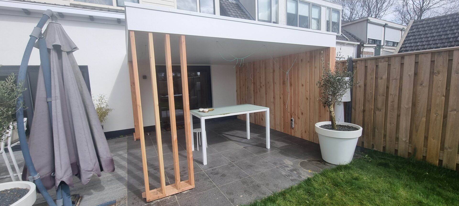 De open houten kolommen zijn uitgevoerd in geschaafd Douglas hout, wat het geheel een luchtige en eigentijdse uitstraling geeft. Dankzij de zorgvuldige aansluiting op de bestaande woning voelt deze overkapping als een natuurlijke verlenging van de leefruimte.